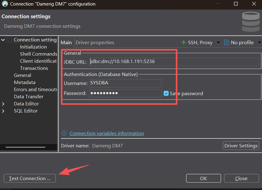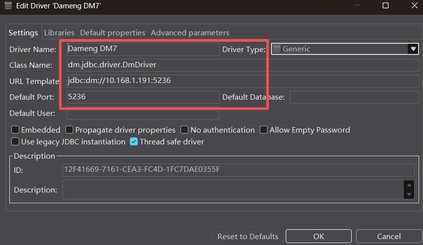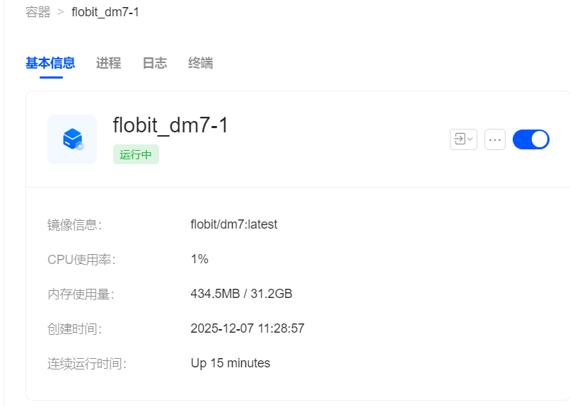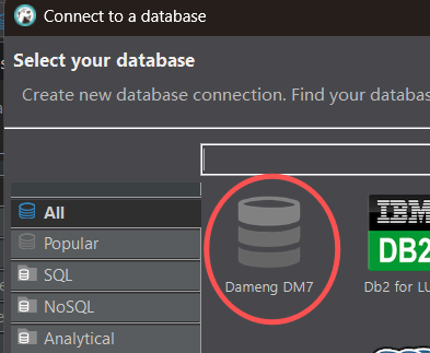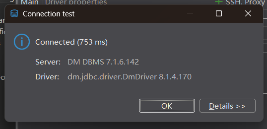 ## docker-compose方式安装 可以使用 docker-compose 的安装 方式: ~~~ version: "3.1" services: dm7: image: harbocto.xxx.com.cn/public/dm7 environment: DM_DBA_PASSWORD: Boe888888 TZ: Asia/Shanghai restart: always ports: - 5236:5236 volumes: - /etc/hosts:/etc/hosts - ./dmdbms:/opt/dmdbms - ./start.sh:/root/start.sh ~~~ 镜像使用 flobit/dm7 这个,,我用的绿联nas,可以搜索到这个镜像。 上面的 harbocto.xxx.com.cn/public/dm7 地址,可能 要根据实际情况替换,Boe888888也一样,这个是 SYSDBA 的密码。 ## 普通安装的方式(我用了这种方式) 我 这里使用普通的docker run 的安装 方式。使用绿联 图形化的界面安装。 注意点就是 配置一下:`DM_DBA_PASSWORD: Boe888888` dmdbms目录可映射,也可不映射,如果只是测试的话 无所谓。 运行命令自动识别出来了这两个:  绿联nas 一次就成功安装 了。  ## 使用客户端进行连接 我这里使用的是dbeaver Version 25 ce版本。 dbeaver连接达梦7,我这里使用的是jdbc的方式。 到达梦的官方下载jdbc的驱动,下载地址:https://eco.dameng.com/download/ 下载解压 后会看到一个: `DmJdbcDriver8.jar` 找开dbeaver。 顶部菜单点击 Database,然后选择DriverManager。 新增: driver name: Dameng DM7 class name : dm.jdbc.driver.DmDriver url template: dbc:dm://10.168.1.191:5236 default port : 5236  切换libraries页面 addfile,选择刚刚下载的 `DmJdbcDriver8.jar`的绝对路径。  保存后,回到主界面,然后新增一个connection.  我这里已经添加好了啊。。 主要就是 jdbc url: jdbc:dm://10.168.1.191:5236 和 用户名密码: 用户名是SYSDBA 密码就是刚刚你docker新建的时候设置的 `DM_DBA_PASSWORD`的值。。  点击测试一下: 看到下面的界面就说明 成功啦~~