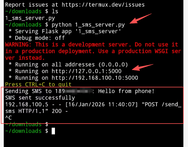 使用 Termux + Python + Flask/FastAPI实现安卓手机发短信